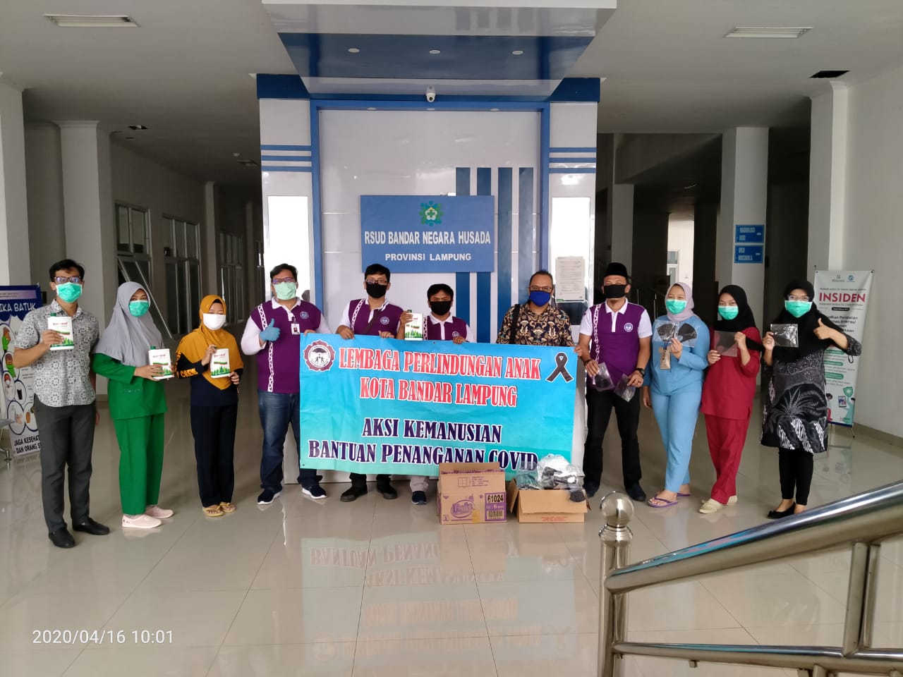 POLIS, Bandar Lampung – Lembaga Perlindungan Anak (LPA Kota Bandar Lampung) pada hari ini (16/4/2020) melaksanakan kegiatan Aksi Kemanusian “Bantuan Penanganan Covid-19 di RSUD BNH” dengan memberikan bantuan berupa masker, desinfektan, handsanitizer dan nasi kotak makan siang untuk Tim Medis dan Tim Pendukung Operasional di Rumah Sakit Umum Daerah Bandar Negara Husada (RSUD BNH), Kota Baru, Lampung Selatan.