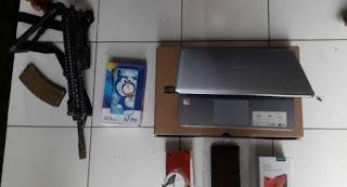 Sambungnya, dalam penangkapan tersebut turut diamankan barang bukti berupa enjata laras panjang replika SS1 berikut magazine kosong yang digunakan menakuti korban, 2 utas tali tambang jenis rafia warna hijau, kayu panjang sekira 1 meter, 2 buah kotak HP, 1 HP Vivo, 1 Laptop dan kotaknya.