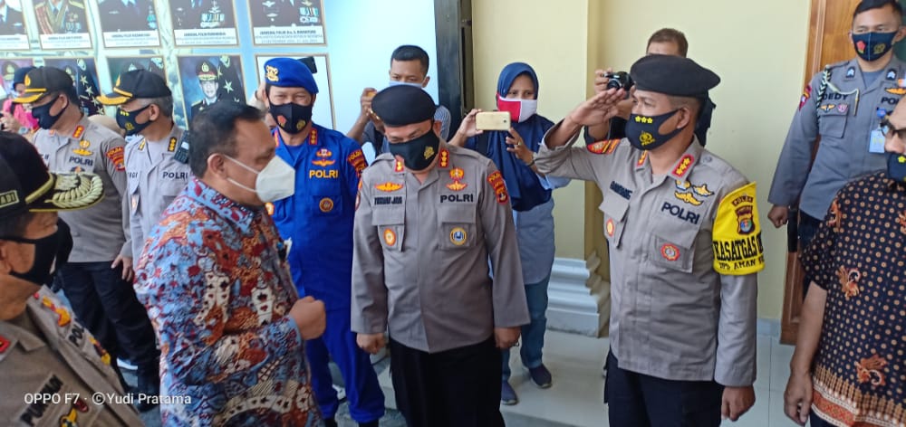 Bandar Lampung | Kapolda Lampung Irjen Pol Drs. Purwadi Arianto, M.Si., bersama Wakapolda Lampung Brigjen Pol Drs. Sudarsono, S.H., M.Hum., dan seluruh Pejabat Utama Polda Lampung sambut langsung kedatangan Ketua Komisi Pemberantas Korupsi Republik Indonesia (KPK RI) Komjen Pol Drs. Firli Bahuri, M.Si., beserta rombongan dalam rangka kunjungan kerja dan audiensi pencegahan dan pemberantasan korupsi di Polda Lampung. Jumat, 7 Agustus 2020.