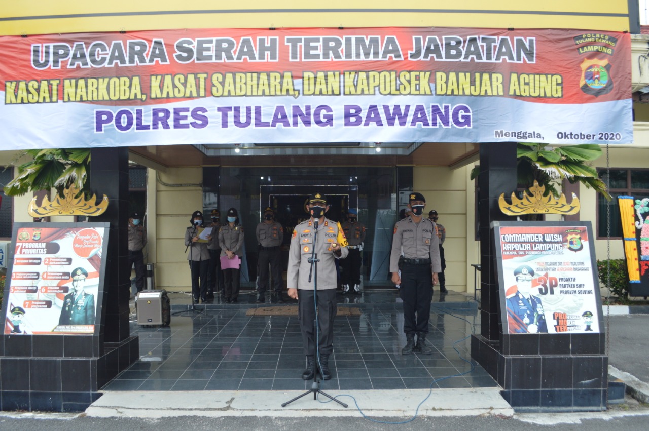 Polres Tulang Bawang menggelar upacara serah terima jabatan (sertijab) dua Kepala Satuan (Kasat) dan satu Kepala Kepolisian Sektor (Kapolsek).