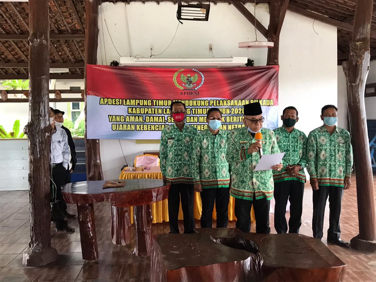 Hal senada juga diungkapkan oleh ketua DPC APDESI Lampung Timur Drs. GUNA WIJAYA Jelang Pilkada 9 Desember ini kita semua berupaya untuk menjaga situasi Kamtibmas yang aman dan kondusif serta jangan lupa mengedepankan Protokol Kesehatan. ” Sukseskan Pilkada Lamtim tahun 2020, ajak masyarakat untuk ke TPS, Jalankan Protokol Kesehatan dan kedepankan sikap persaudaraan”