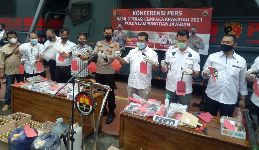 Bandar Lampung – Polda Lampung menggelar konferensi pers hasil Operasi Kepolisian Kewilayahan Polda dan Polres jajaran dengan sandi operasi “Cempaka Krakatau-2021” pada tanggal 15-28 Februari 2021.