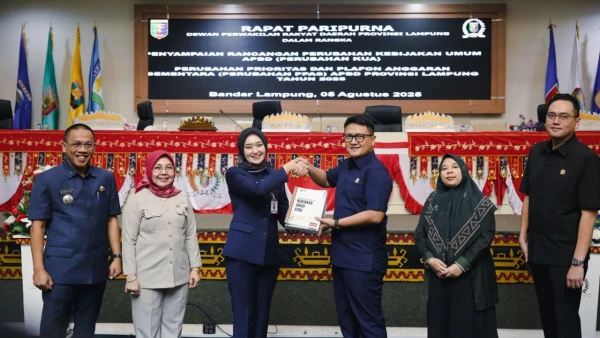 REAKSI.CO.ID – Pemerintah Provinsi (Pemprov) Lampung menyerahkan dokumen Rancangan Perubahan Kebijakan Umum APBD dan Prioritas Plafon Anggaran Sementara (KUA-PPAS) Tahun 2025, serta Rancangan KUA-PPAS Tahun 2026, kepada DPRD Provinsi Lampung.