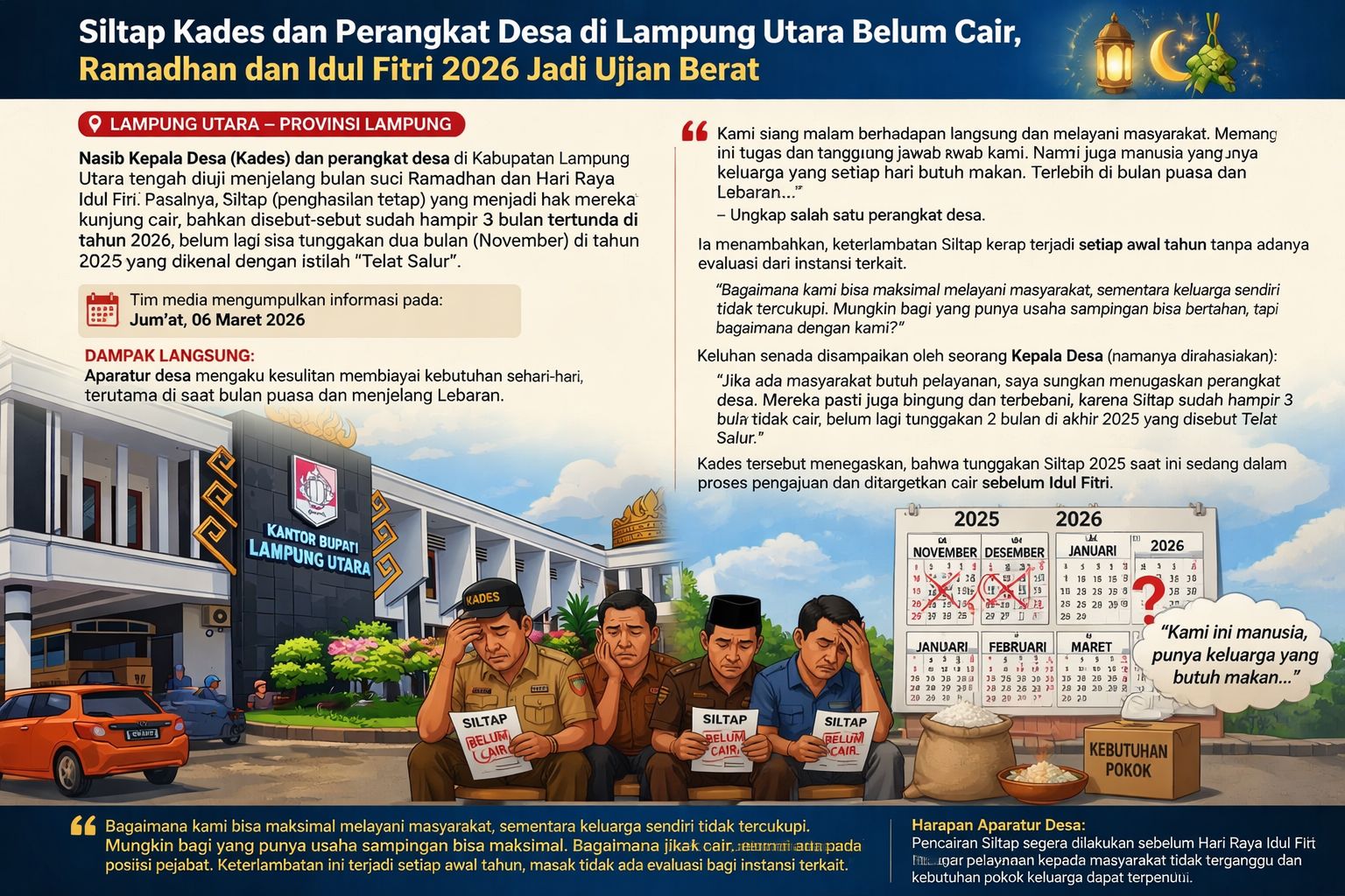 Kepala desa dan perangkat desa di Kabupaten Lampung Utara, Provinsi Lampung, mengeluhkan keterlambatan pencairan penghasilan tetap (Siltap) yang hingga kini belum diterima. Keterlambatan tersebut terjadi di tengah bulan Ramadan dan menjelang Hari Raya Idulfitri 2026.