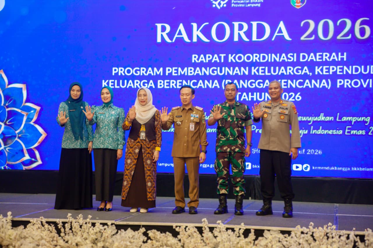 Apresiasi diserahkan oleh Kepala Perwakilan BKKBN Provinsi Lampung, Soetriningsih, kepada Pemerintah Provinsi Lampung yang diwakili oleh Ketua TP PKK Provinsi Lampung Purnama Wulan Sari, dalam kegiatan Rapat Koordinasi Daerah (Rakorda) Program Bangga Kencana Provinsi Lampung Tahun 2026 di Hotel Radisson, Selasa (28/04/2026).