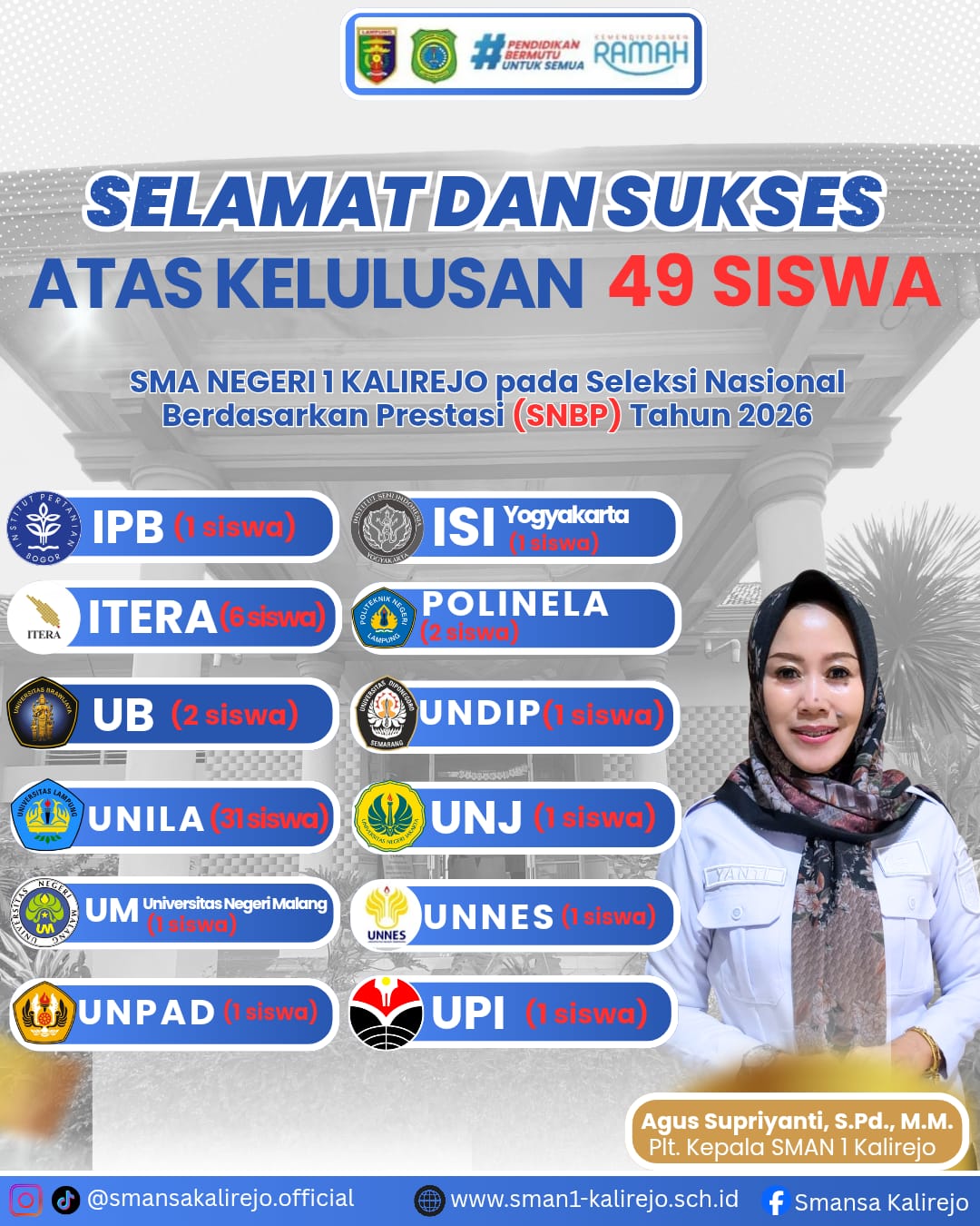 Agus Supriyanti,Spd,MM. mengucapkan selamat dan rasa bangga kepada para siswa/i yang telah lolos melalui jalur SNBP tahun 2026.